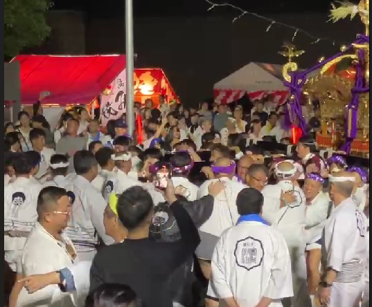 神輿の重量で台車が破損し、急遽、担いで入ることに。長い道のり、水分の用意もしておらず、途中で何度も立ち止まり、行列は進まず。