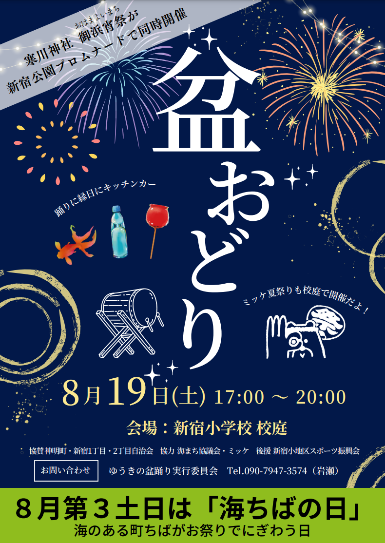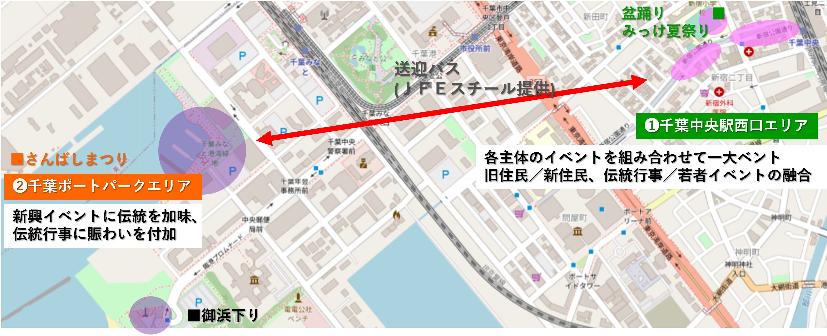 ・千葉中央駅西口の「ミッケ夏祭り *1」「盆踊り *2」「さい石さんが大会 *3」と「御浜宵宮」を同時開催